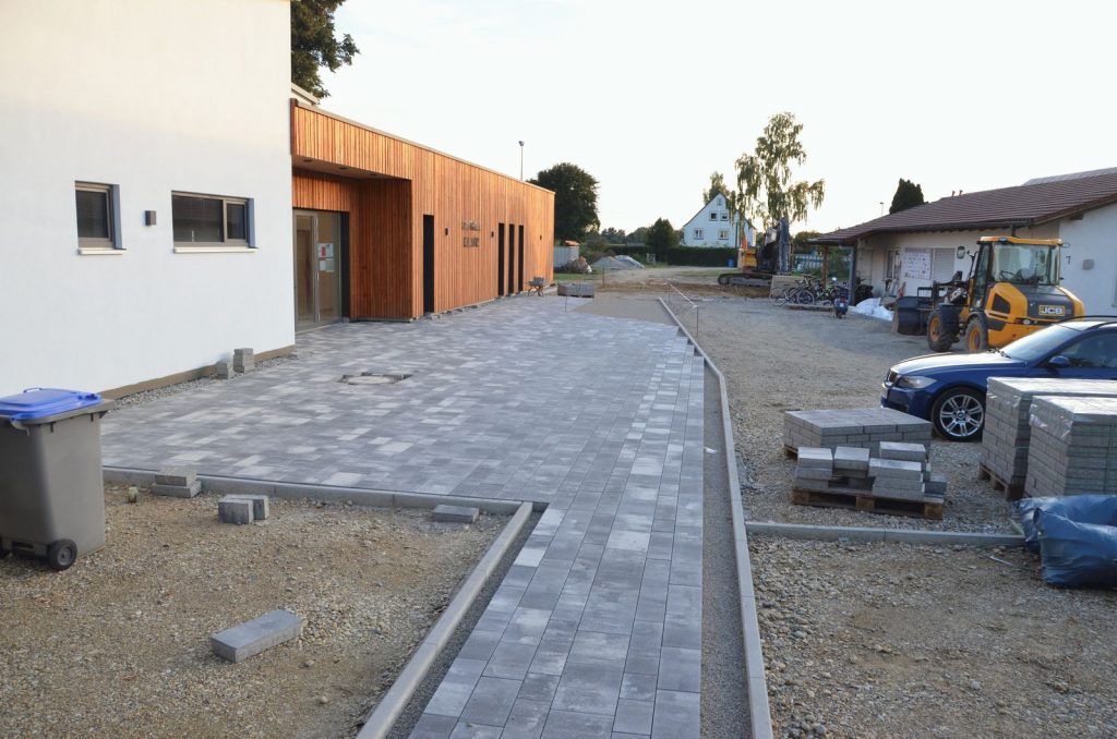 Außenanlagen Teil 3 von adminHalle | Sep. 22, 2021 | Bautagebuch ab 22.09.2021 wurde das Anlegen der Außenanlagen fortgeführt.– Pflastern vor Eingang– Setzen der Randsteine für Gehwege